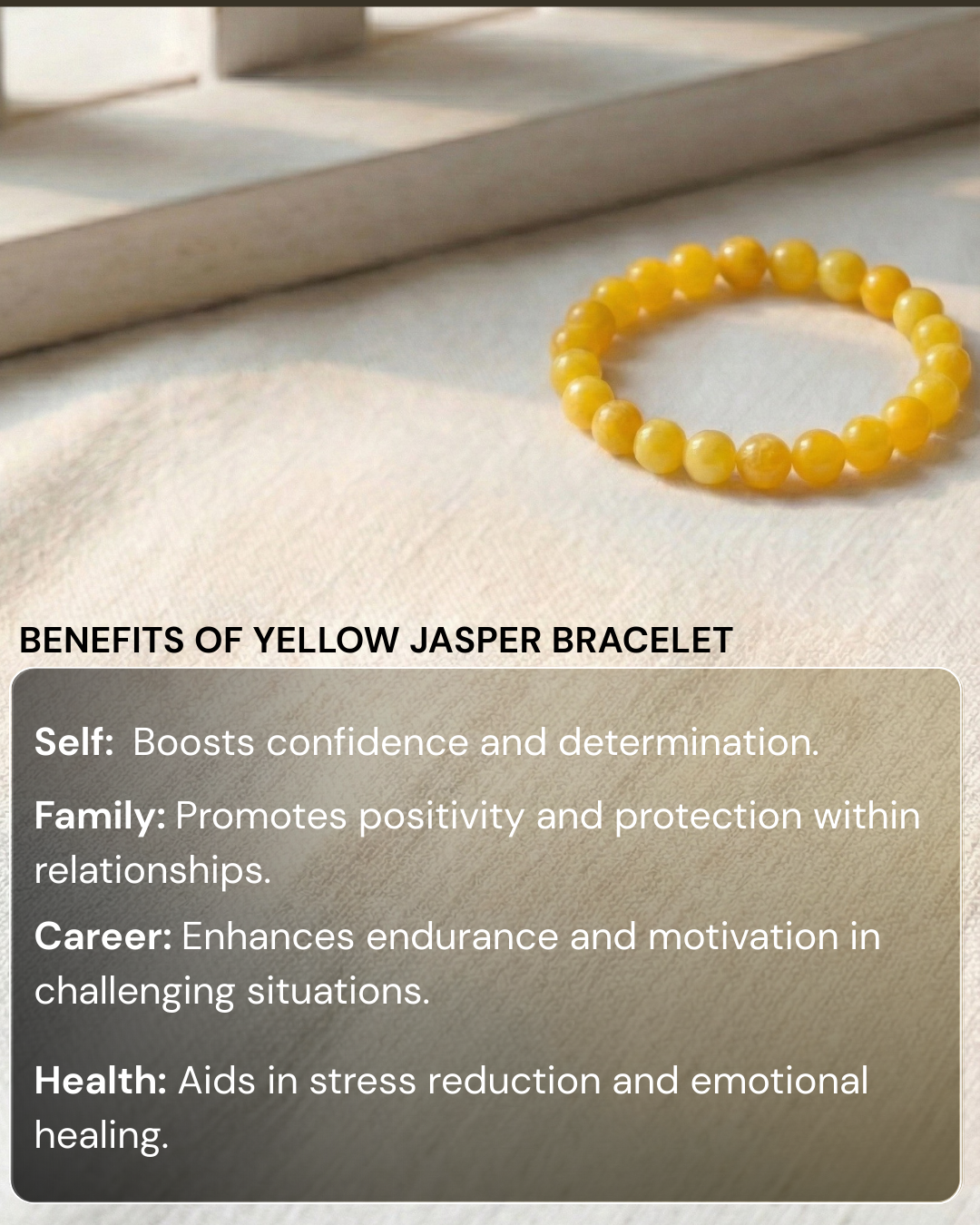 The Yellow Jasper bracelet is known for promoting confidence, endurance, and protection. It enhances positivity and determination in challenging situations.