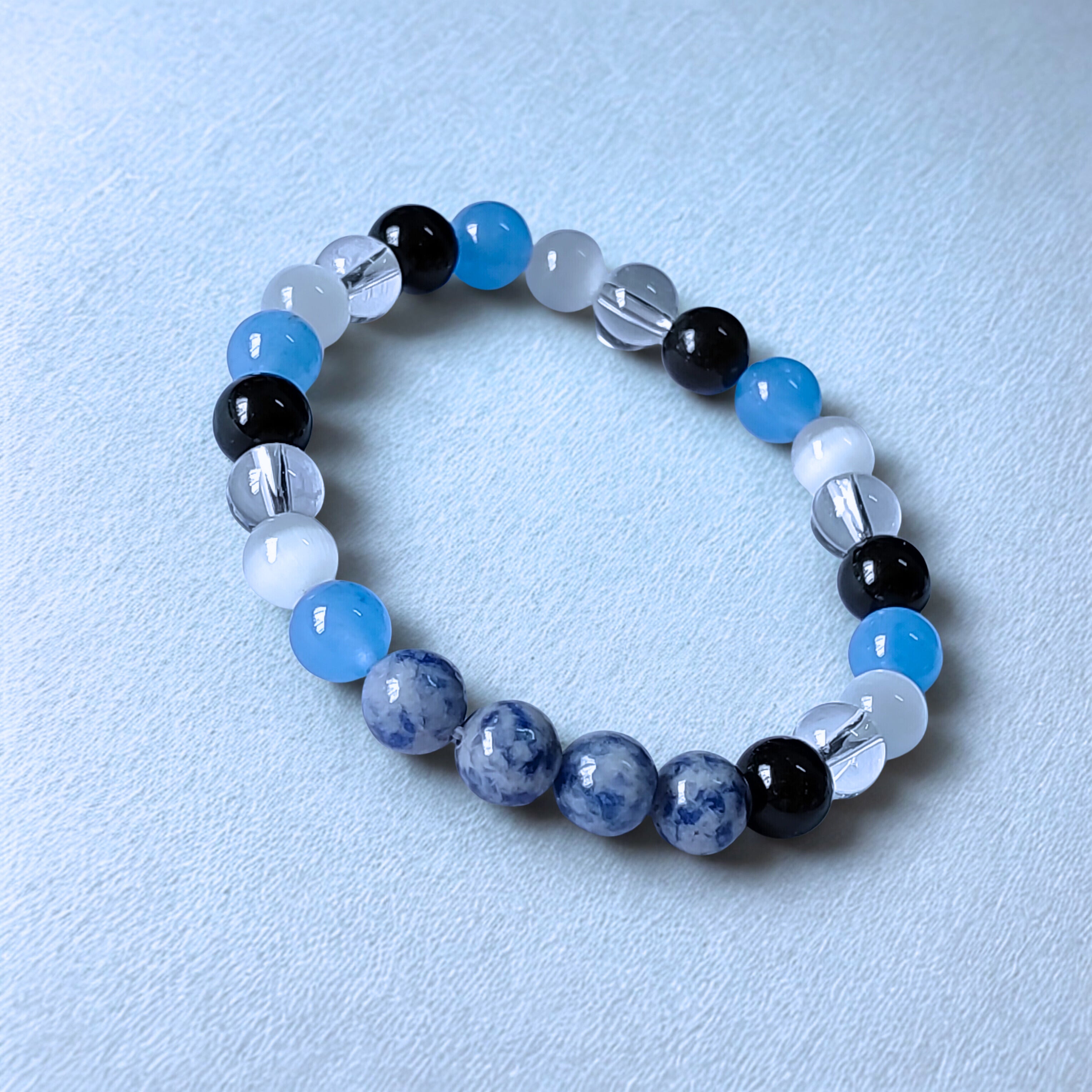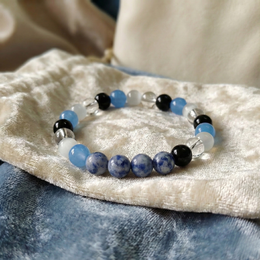 Stone: [COMBINATION OF SODALITE + BLUE CHALCEDONY + SELENITE + CLEAR QUARTZ CRYSTAL + BLACK TOURMALINE]